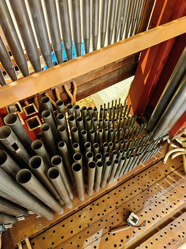 Nous avons ensuite consciencieusement nettoyé chaque élément. L'ensemble de la tuyauterie en métal a été nettoyé et toutes les pièces de bois ont été décrassées. Grâce au dévouement de cette équipe formée de huit personnes, l'orgue a été remonté dans son état initial en seulement dix jours.