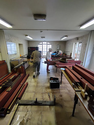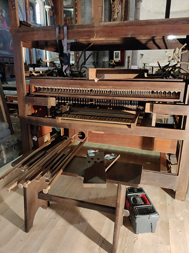 Nous avons ensuite consciencieusement nettoyé chaque élément. L'ensemble de la tuyauterie en métal a été nettoyé et toutes les pièces de bois ont été décrassées. Grâce au dévouement de cette équipe formée de huit personnes, l'orgue a été remonté dans son état initial en seulement dix jours.