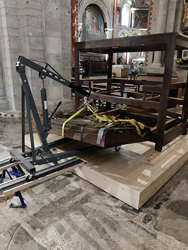 Suite à l'arrivée du camion à Oloron, nous avons déchargé tous les éléments au presbytère.